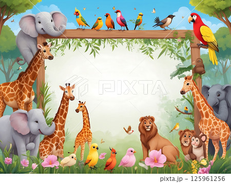 A vibrant, colorful arrangement of paper flowers and butterflies with a blank space in the center, creating a visually appealing and artistic design.