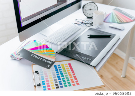テーマカラーを選んでいるデザイナー・イラストレーターのオフィスにあるデスク