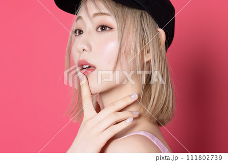 ピンク背景で撮影をした若い女性のポップなポートレート