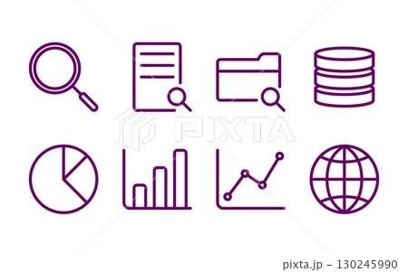 マーケティングと統計解析のアイコン集/棒グラフ・円グラフ・折れ線グラフなど/紫カラー線画