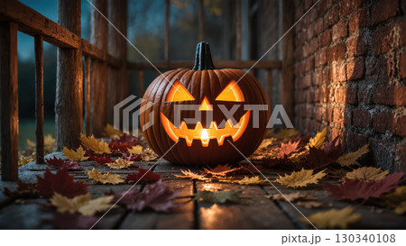 Carved jack-o'-lantern glowing on wooden porch with colorful autumn leaves and brick wall during Halloween evening.