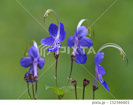 北摂の山で見た青紫色の花弁に長く伸びた雄しべ・雌しべの花の集散花序が綺麗なカリガネソウ