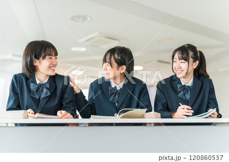 学校の教室で授業中に楽しく話す制服姿の小学生・中学生・高校生・女子高生(友達)