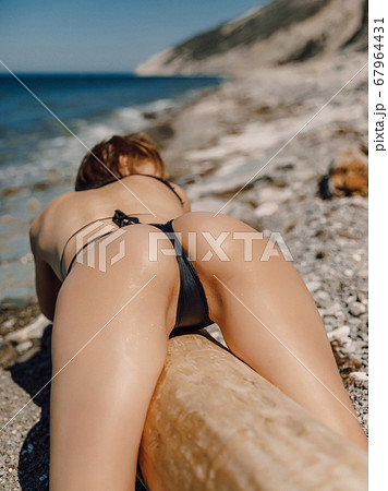 Sexy young woman in bikini posing at stone beach. Attractive model with sporty body