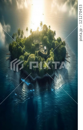 Top view of isolated rocky tropical island with turquoise water and white beach. Floating island