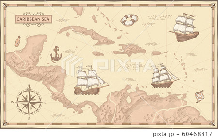 Old caribbean sea map. Ancient pirate routes, fantasy sea pirates ships and vintage pirate maps vector concept illustration