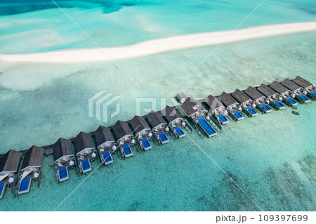 stunning blue ocean and sandy lux hotels on water top drone aeral view Maldives beach copyspace for text