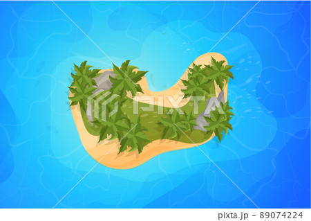 Tropical island top view, resort with palm trees, sand and waves in cartoon style isolated on white background. Summer aerial, landscape.