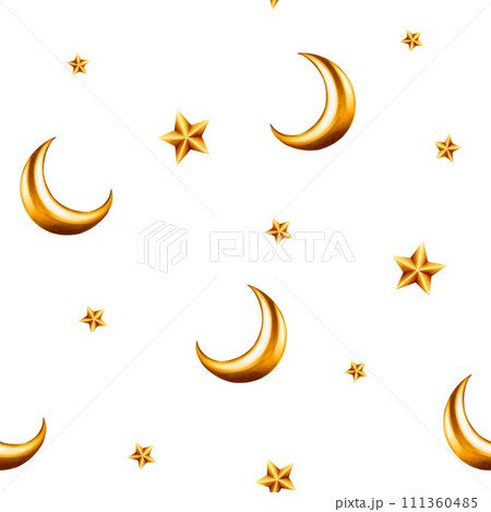 Watercolor seamless pattern with Islamic arabian golden crescent moons and stars on illustration isolated on background. Muslim golden hand drawn holiday Ramadan Kareem or Eid Al Adha 2024. For