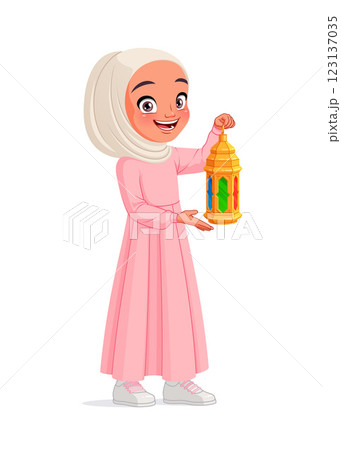 Muslim girl in hijab holding lantern celebrating Ramadan. Eid Mubarak vector illustration.