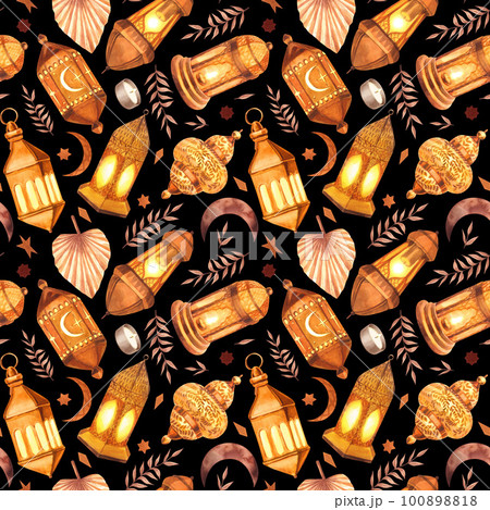 Watercolor painted seamless pattern islamic object. Hand-drawn illustration isolated on black background. For islamic celebration day ramadan kareem, eid al fitr adha, arab design.