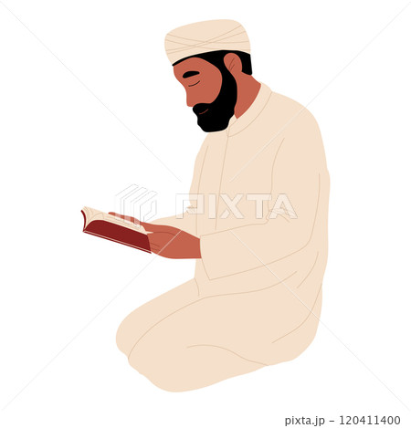 Muslim man reads Koran. Ramadan Mubarak celebration. Traditional Muslim holiday