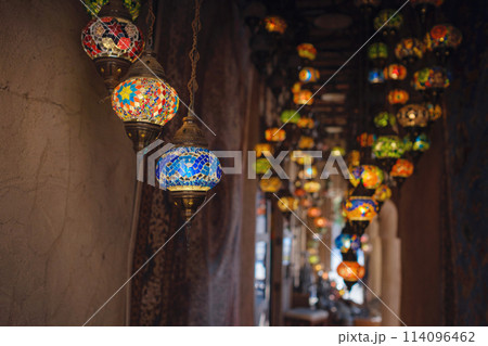 Old historic district in Dubai. Oriental Arabic Colorful glass pendant lamps in Colorful Arabic shop souvenir.