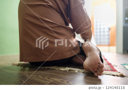 Portrait of an Indonesian muslim man praying (salat) at home. Concept of Islamic praying or Ramadan Kareem