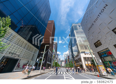 日本の東京都市景観 銀座の街並みや太陽光などを望む(歩行者天国)
