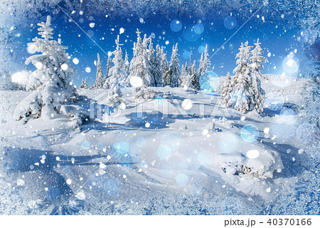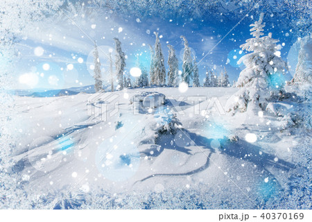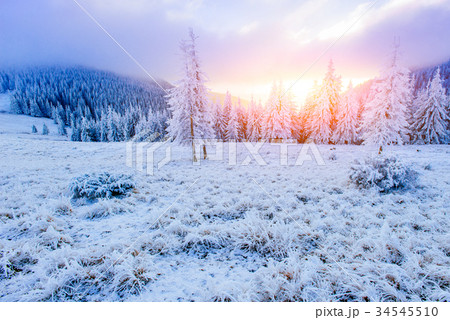 winter landscape in mountains at sunrise. beautiful rural area of carpathian mountains with snow covered hills. glowing clouds on the sky. frosty weather