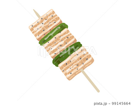 皿に盛り付けられた、豚バラとシシトウガラシの、串焼きのイラスト