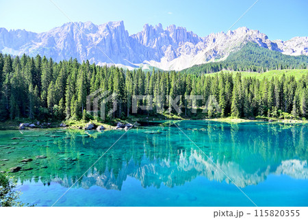 ドロミテのカレッツァ湖とラテマールの峰々