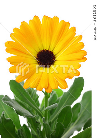 Calendula officinalis. Marigold flower with leaf isolated on white background
