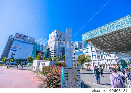 日本の東京都市景観 川崎駅前南の交差点からルフロン川崎や川崎駅前の街並みなどを望む。手前は京浜急行