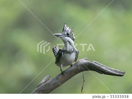 川の上流にある枯れ木の枝で休む一羽のヤマセミ