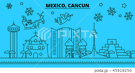 Mexico, Cancun winter holidays skyline. Merry Christmas, Happy New Year decorated banner with Santa