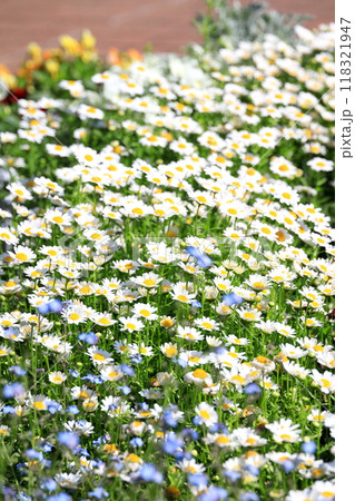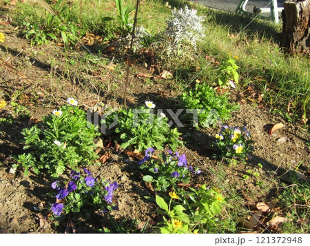 こじま花の会花畑のビオラの花と白いノースポールの花