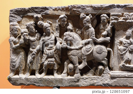 パキスタンの古都タキシラにある博物館に展示される佛陀の生涯彫刻の中の城を出るシッダルタの画面彫刻