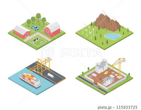 Set of isolated city vector elements. Blocks with icons with farm, port, mountains and lake, construction site.