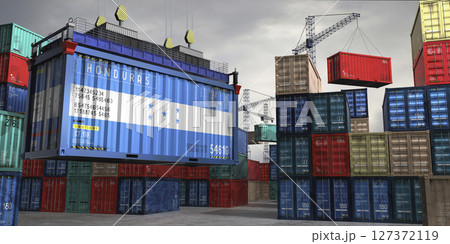 Cargo container with flag of Honduras lifted by crane at freight terminal - 3D illustration