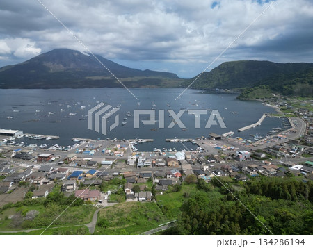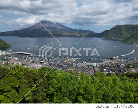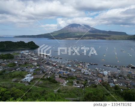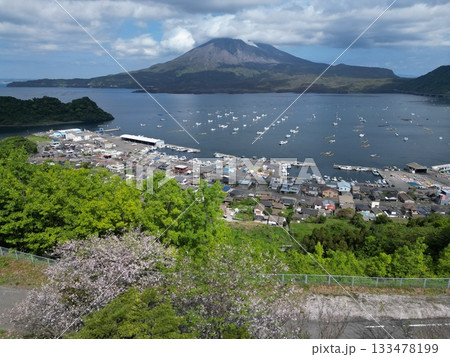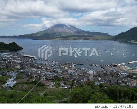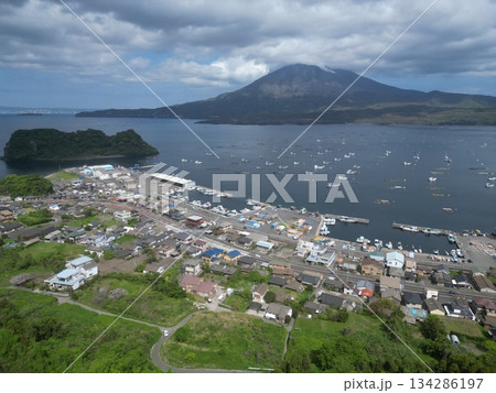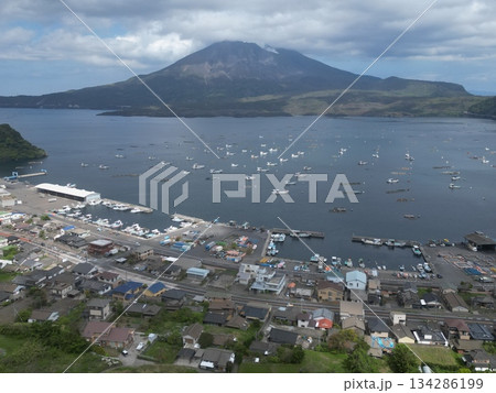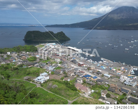 桜島と錦江湾を望む風光明媚な海潟漁港の空撮