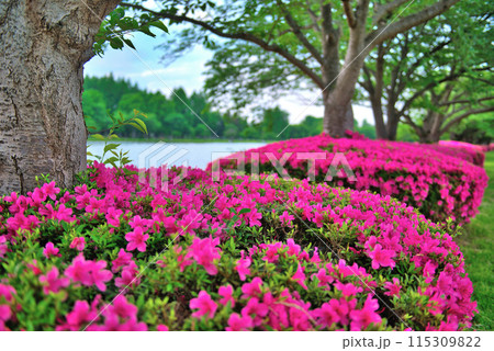 埼玉県営みさと公園の満開のツツジとさくら並木の風景
