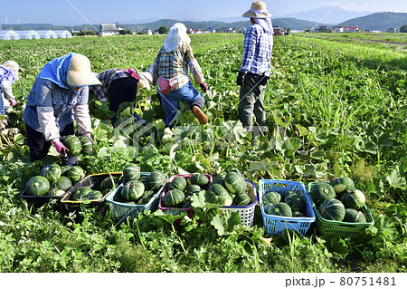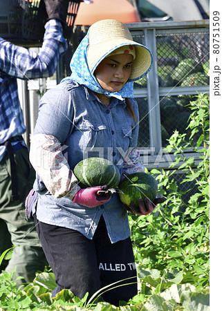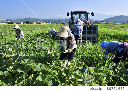 夏の北海道厚沢部町でかぼちゃの収穫作業の風景を撮影