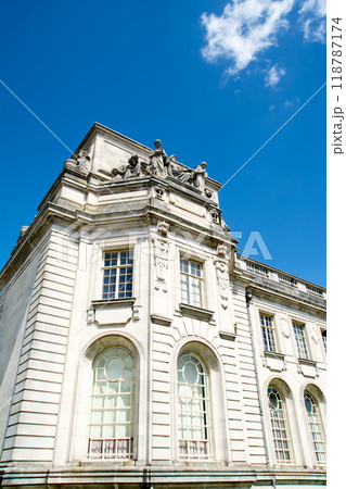 真っ青な空の下の歴史的な石造りの建物のカーディフ・クラウン・コート ウェールズの首都カーディフにて