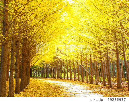 秋の山形県総合運動公園のいちょう並木 イチョウの葉の絨毯 山形県天童市