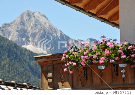 ドイツ、ミッテンヴァルト、花のあるベランダ、カーヴェンデル山