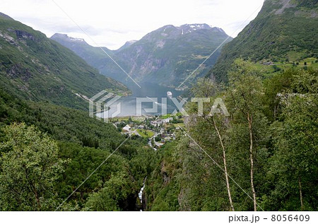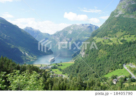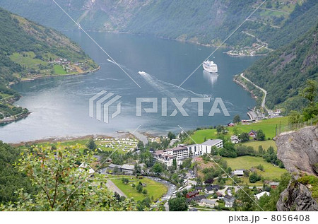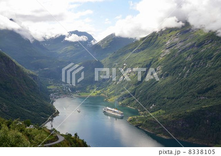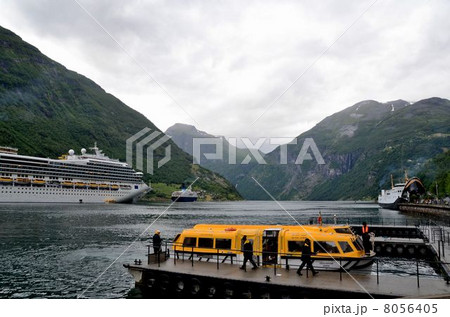 クルーズ船が停泊する穏やかな世界遺産ガイランゲルフィヨルド