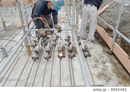 工事現場 新築マンション 柱筋のガス圧接工事作業風景