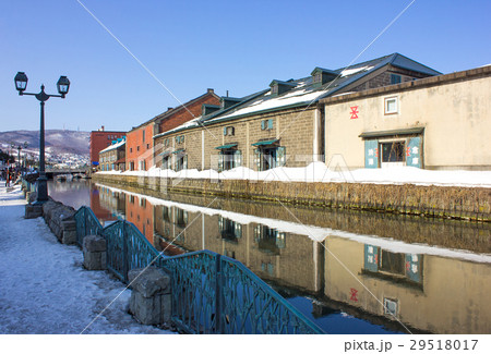 新緑の北海道小樽市、中央橋方面から見る南側の小樽運河の倉庫群