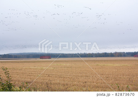 A big flock of barnacle gooses is flying above the field. Birds are preparing to migrate south. September 2019, Finland