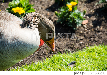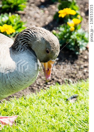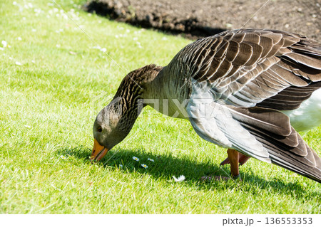 明るい日差しの下の芝生の上でくつろぐガチョウ ロンドン郊外のキューガーデンにて