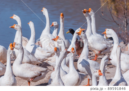 White ducks with a blurry brown ground background in a sunny day. selective focus.