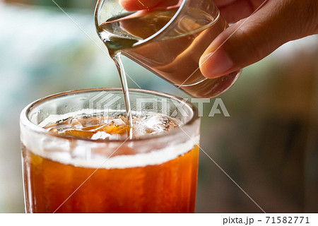 冷たいお茶に注がれるガムシロップ