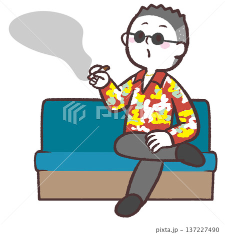 ソファーに座って喫煙する派手なシャツの男性のイラスト