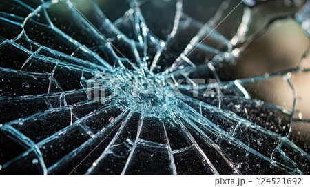 Broken glass shards on dark floor. Fragmented pieces and sharp edges