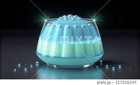 A striking blue dessert is set in a glass bowl, featuring decorative beads on top. The vibrant color and shine create a captivating visual, enhancing the treat's appeal.