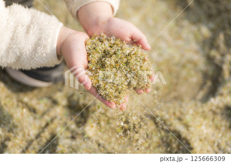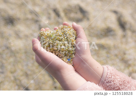 ガラスの砂浜で拾った綺麗なガラスのかけらを見せる女の子の手