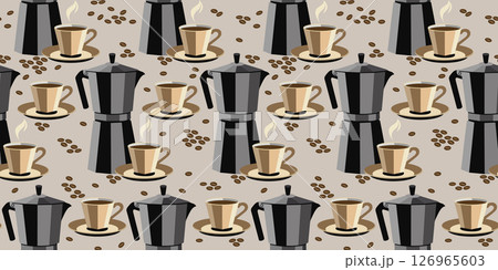 Vector seamless pattern coffee pots, coffee cups and seeds on light beige background