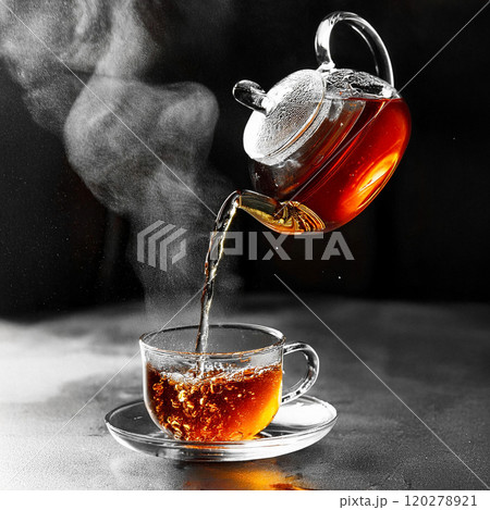空中に浮いたティーポットからティーカップへ紅茶を注ぐ瞬間 幻想的なティータイムのイメージ