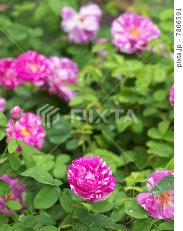 ピンクと白の刷毛目模様が珍しいバラの品種「アラン・ブランシャール(1839年、ドイツ)」の花房。